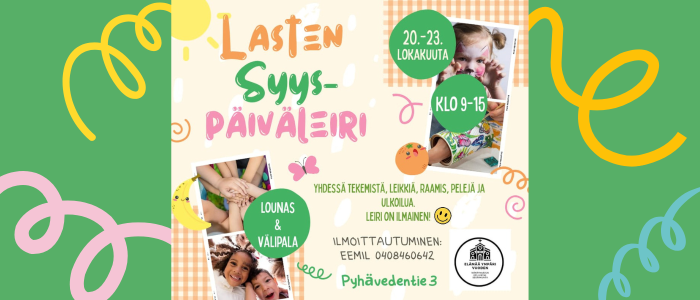 09.00: Lasten syyspäiväleiri 20.–23.10.202509.00: Lasten syyspäiväleiri 20.–23.10.2025 – |